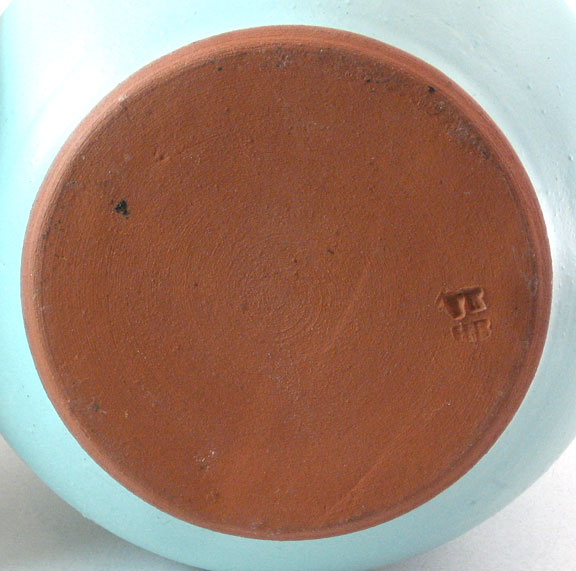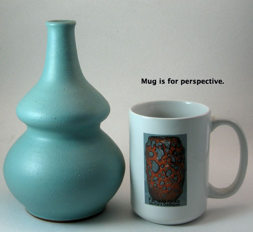 This modified double gourd shaped vase is hand thrown and comes from the Gramann company in East Germany. The impressed TR mark is for Töpferei Römhild or Töperhof Römhild, either of which roughly translates to Römhild Studio. Römhild is also where the company was located, although I tend to refer to the company by the family name Gramann to avoid confusion with any other companies in the same area. The glaze on this vase is monochrome, somewhat unusual for Gramann, and the texture is a bit grainy, which I suspect is from an imperfect firing rather than intent. Still, it's a great form.