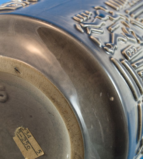 This unusual vase was made by Ilkra in 1963 and designed by K.Schwebsch as part of the "Panorama" series (believed to include 5 vases, each representing a continent). It features a wide variety of motifs that capture various aspects of US life and history. I'm not sure if any of the motifs are aimed at the rest of North America. The primary image is the Statue of Liberty, but there are also musicians, baseball players, cowboys and cows, arrows, a teepee, oil rigs, someone basking beneath a palm tree and several other images. Shape number is 1033. This is a rather hard item to find as well as neat. (Thanks to Volker Hornbostel and Ralf Schumann for information on this one....a tricky attribution.)